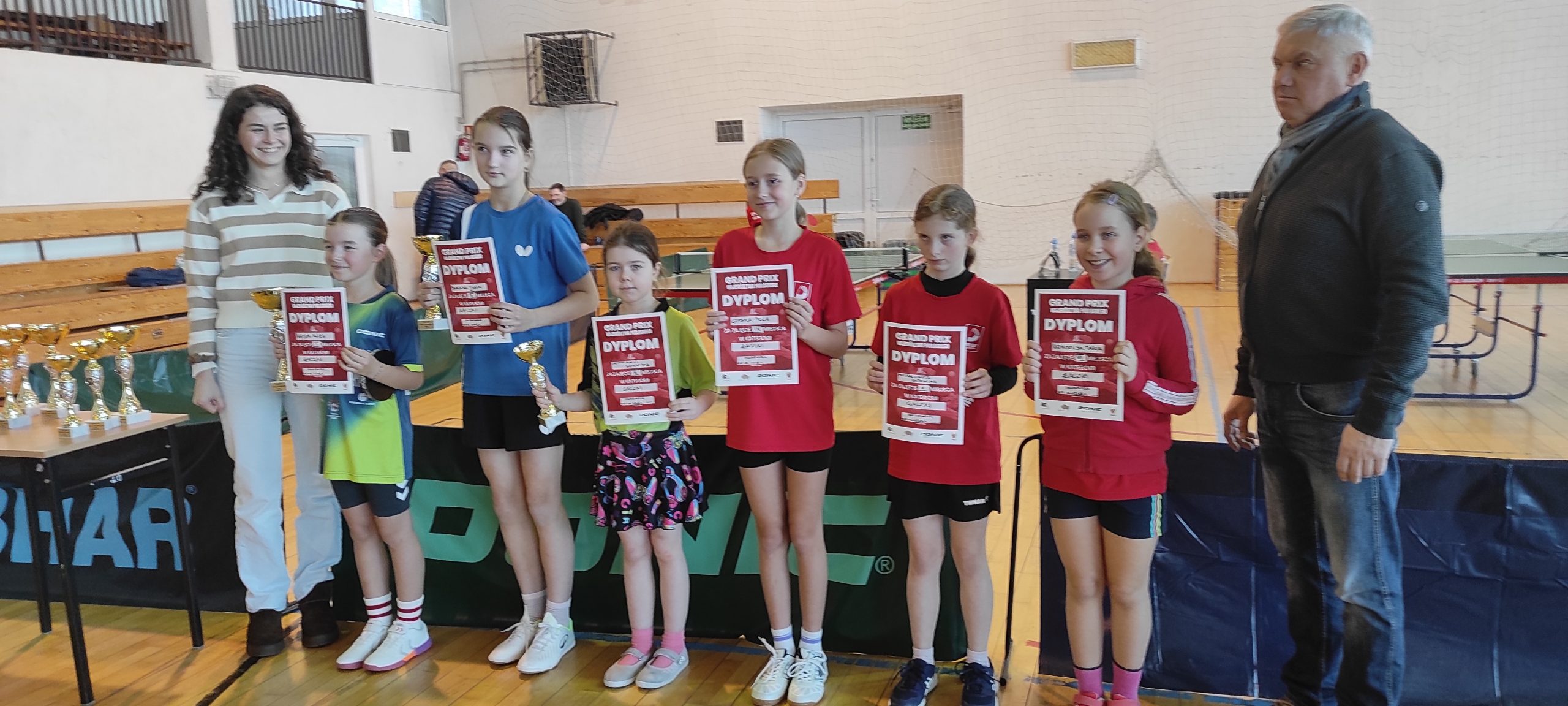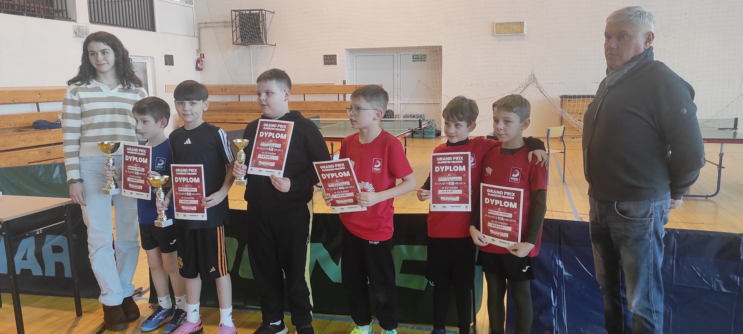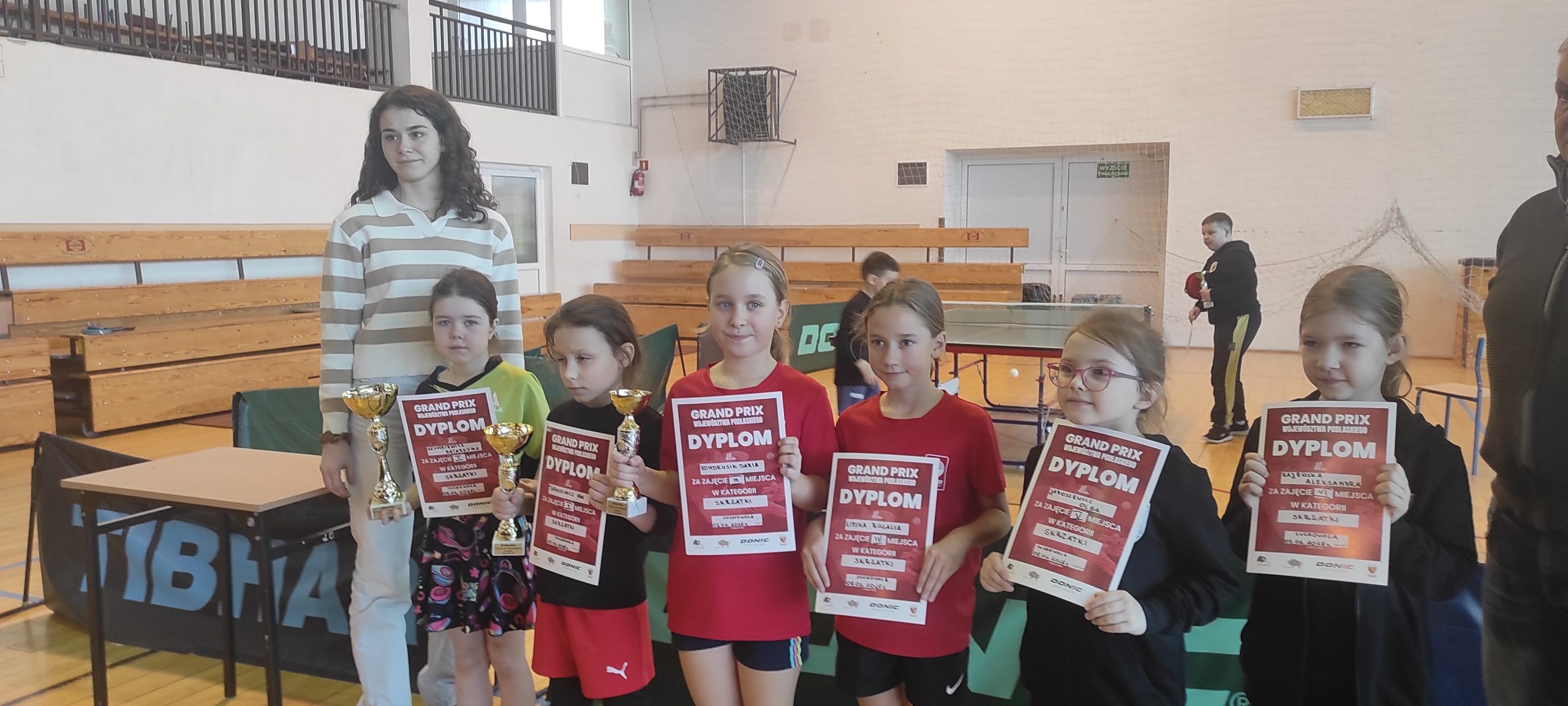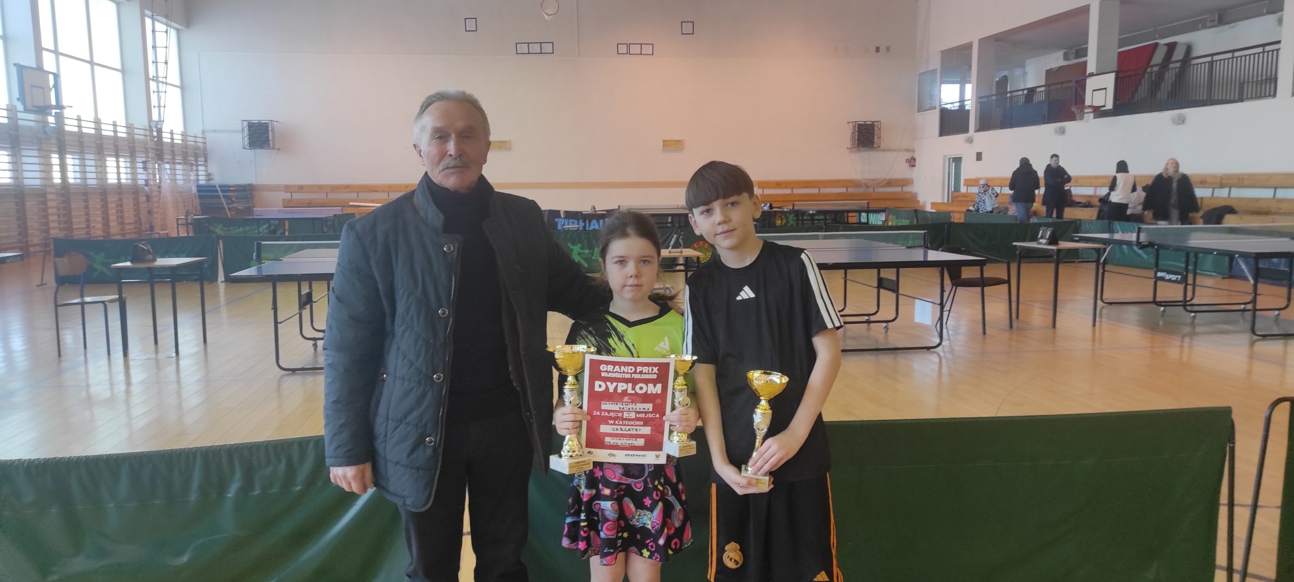 09.02 2026 r. w Suchowoli Kasia Szymkiewicz i Marcel Motycki udowodnili, że należą do najlepszych zawodników tenisa stołowego województwa podlaskiego. W ostatnim w sezonie 2025/2026 turnieju klasyfikacyjnym w kategorii skrzatów Marcel wywalczył drugie miejsce i tylko w finale pokonał go P. Stasiak z białostockich Dojlid. Kasia Szymkiewicz- aktualna mistrzyni województwa za sezon 2024/2025 po raz trzeci zwyciężyła w kategorii skrzatek oraz wywalczyła trzeci stopień podium w żaczkach. Wydawać by się mogło, że grajewscy zawodnicy z marszu wygrywają turnieje. Wygrywanie wcale nie jest takie proste z zawodnikami klubów tenisa stołowego a szczególnie z Białegostoku. Przykładem był ostatni turniej III Grand Prix skrzatów i żaków w Suchowoli, w którym gry o zwycięstwa były wyrównane, często po /3:2/ i zacięte z pojawiającymi łzami w oczach. Każda zawodniczka chce wygrywać z mistrzynią a to liczy się podwójnie.